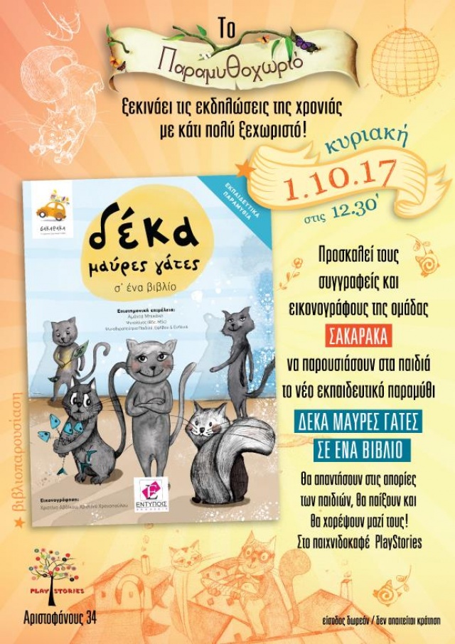 Το Παραμυθοχωριό ξεκινάει τις εκδηλώσεις της χρονιάς με κάτι πολύ ξεχωριστό!! Προσκαλεί τους συγγραφείς και εικονογράφους της ομάδας "Σακαράκα" να παρουσιάσουν στα παιδιά το νέο εκπαιδευτικό παραμύθι "Δέκα μαύρες γάτες σε ένα βιβλίο".